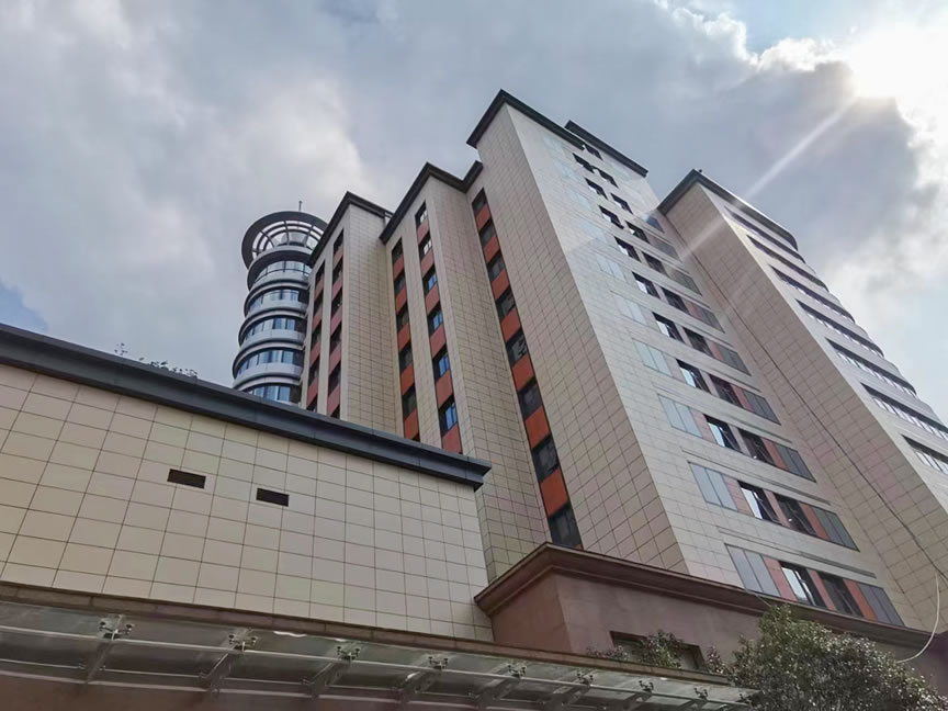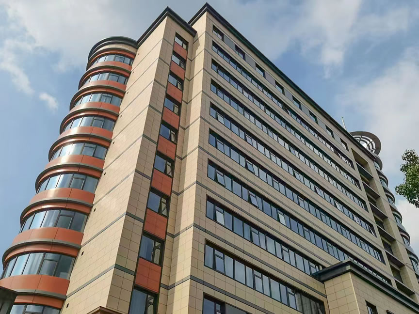 醫(yī)院外立面使用協(xié)進純色陶瓷薄板鋪貼。