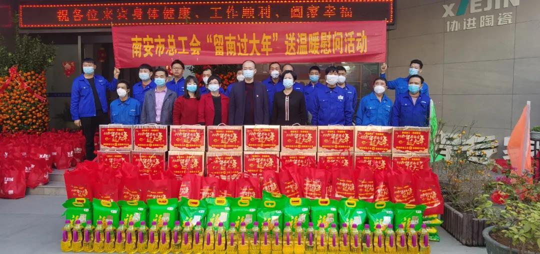 臘月時節,暖風徐徐。南安市紀委監委駐市總工會機關紀檢監察組副組長姚添丁、南安市總工會組織部負責人陳雅婷帶隊,在官橋鎮黨委二級主任科員、鎮總工會主席李彩芳,官橋鎮人力資源和社會保障所所長、鎮總工會副主席蔡偉忠等人的陪同下,蒞臨協進公司走訪慰問留南過年的外來員工,為員工們送來了黨委、政府、工會娘家人的新春關懷和溫暖禮包。
