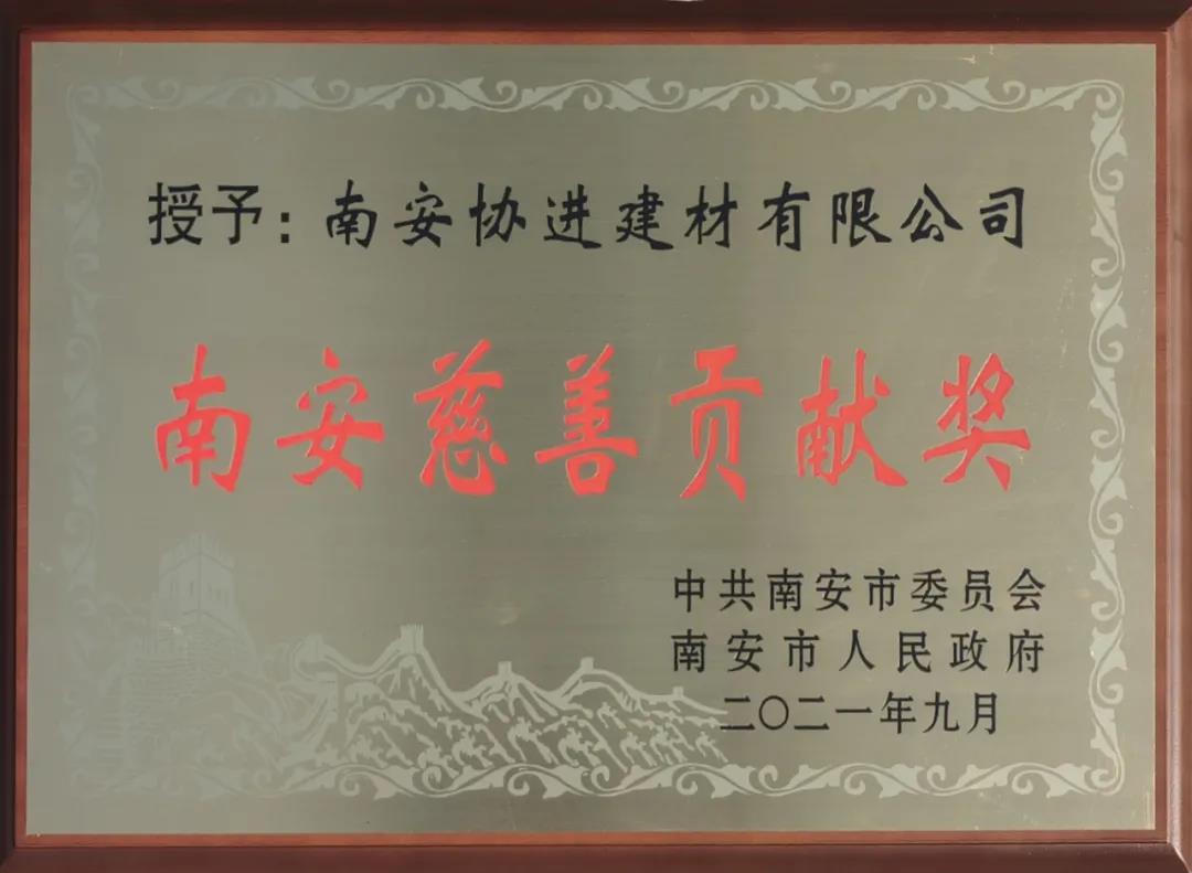 公司倡導“協進一家親,生活更開心”的企業文化理念,在發展的同時不忘回報社會,通過南安市慈善總會、官橋鎮政府、官橋商會以及其他渠道積極、熱心參與教育、醫療(抗疫)、關愛老人、扶貧濟困、文化體育等各項社會公益事業。榮獲南安市委、市政府頒發“南安慈善貢獻獎”。